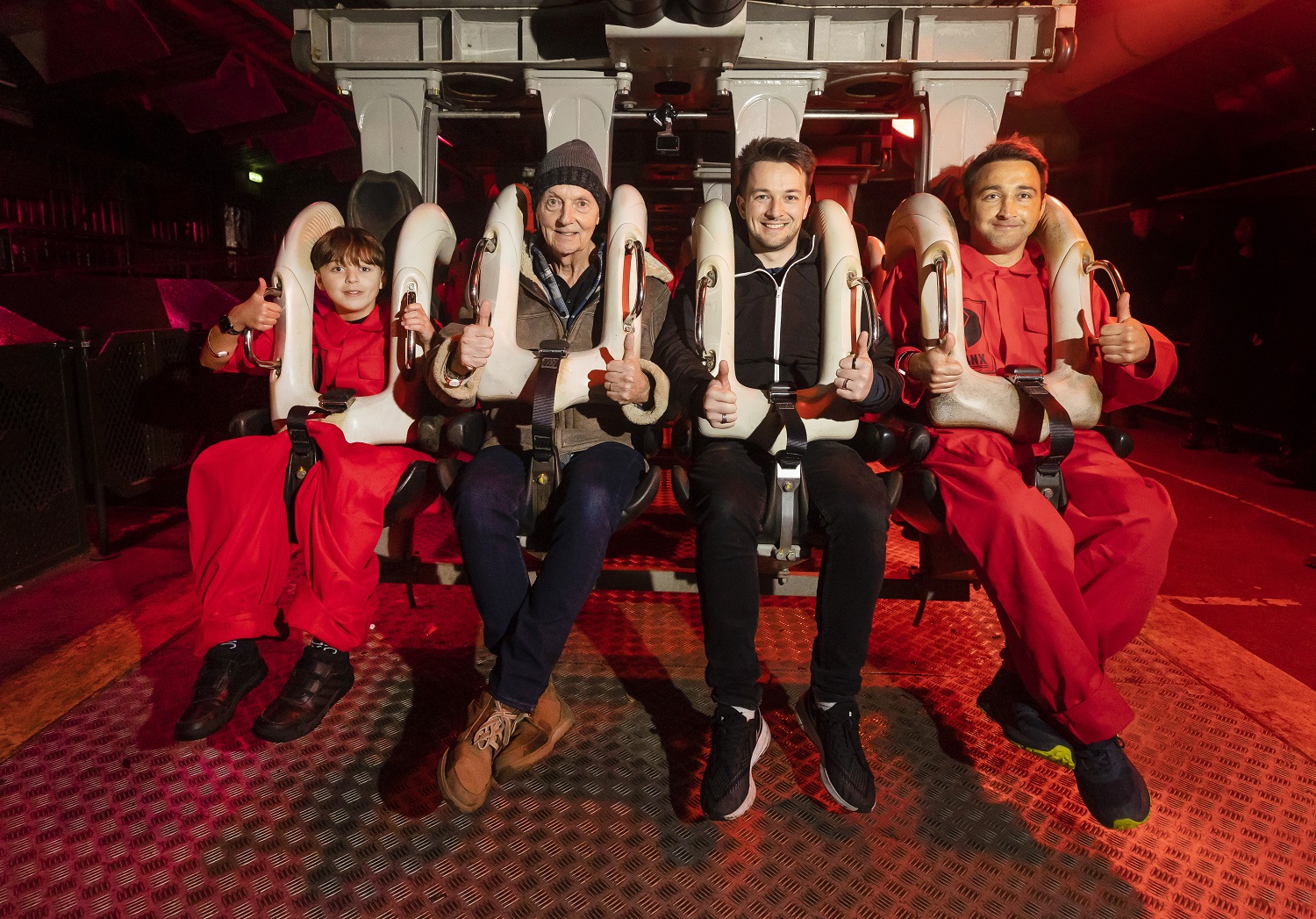 Archie Hillier, John Wardley (creator of the ride), John Burton (creative lead for Merlin Magic Making) and Jack Hillier onboard the last ride of Nemesis at Alton Towers.