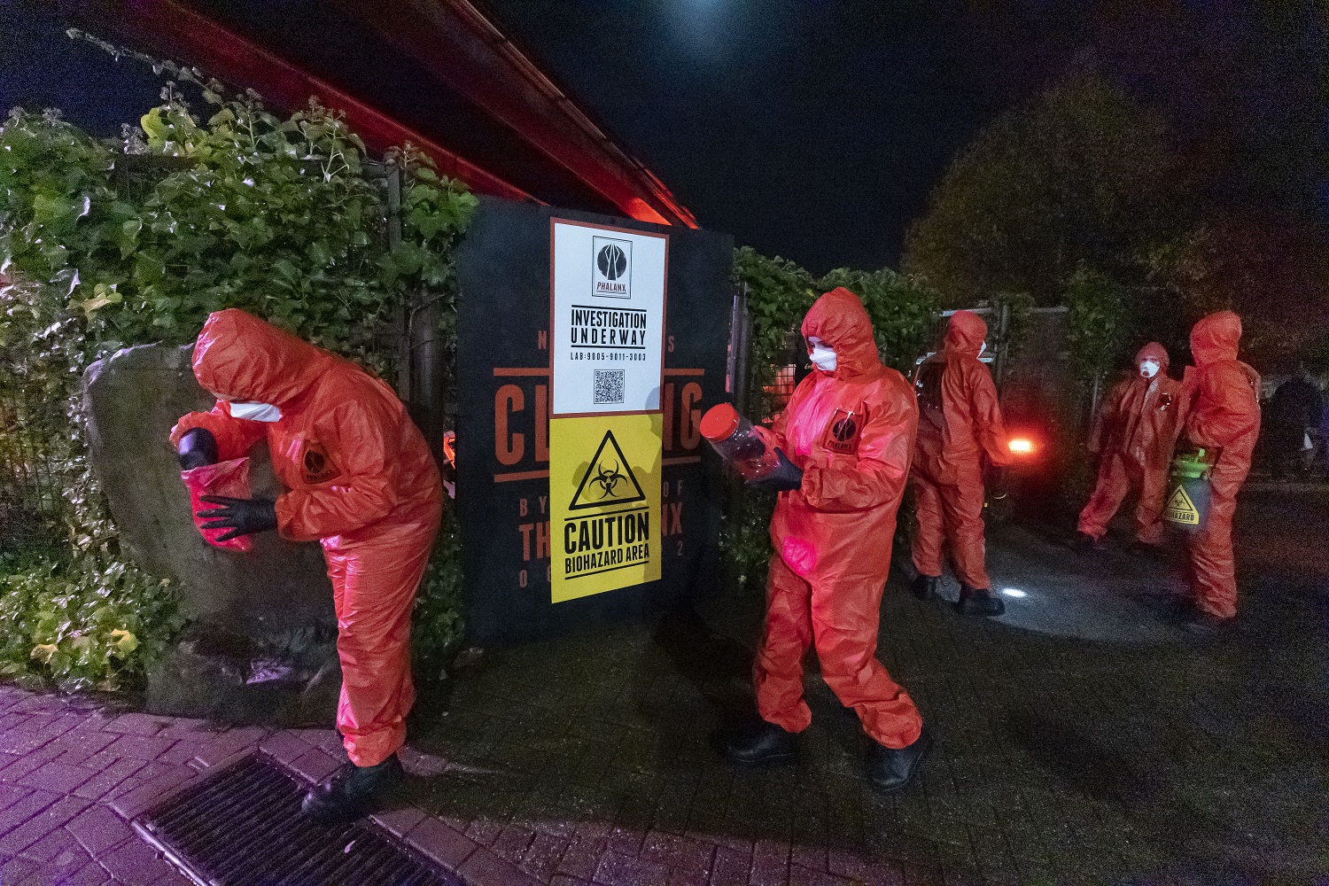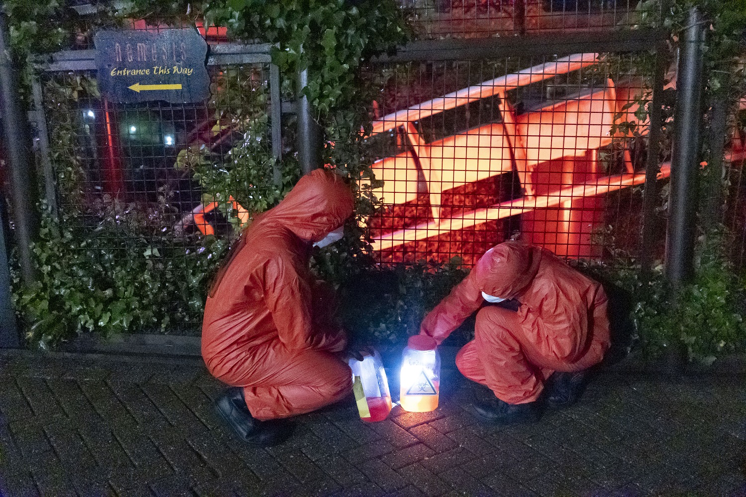Back at the ride, mysterious figures in hazmat suits were seen marching in formation towards Nemesis, with some collecting samples and covering parts of the site in biohazard tape, and white chemical investigation tents were hastily erected around the ride’s entrance.