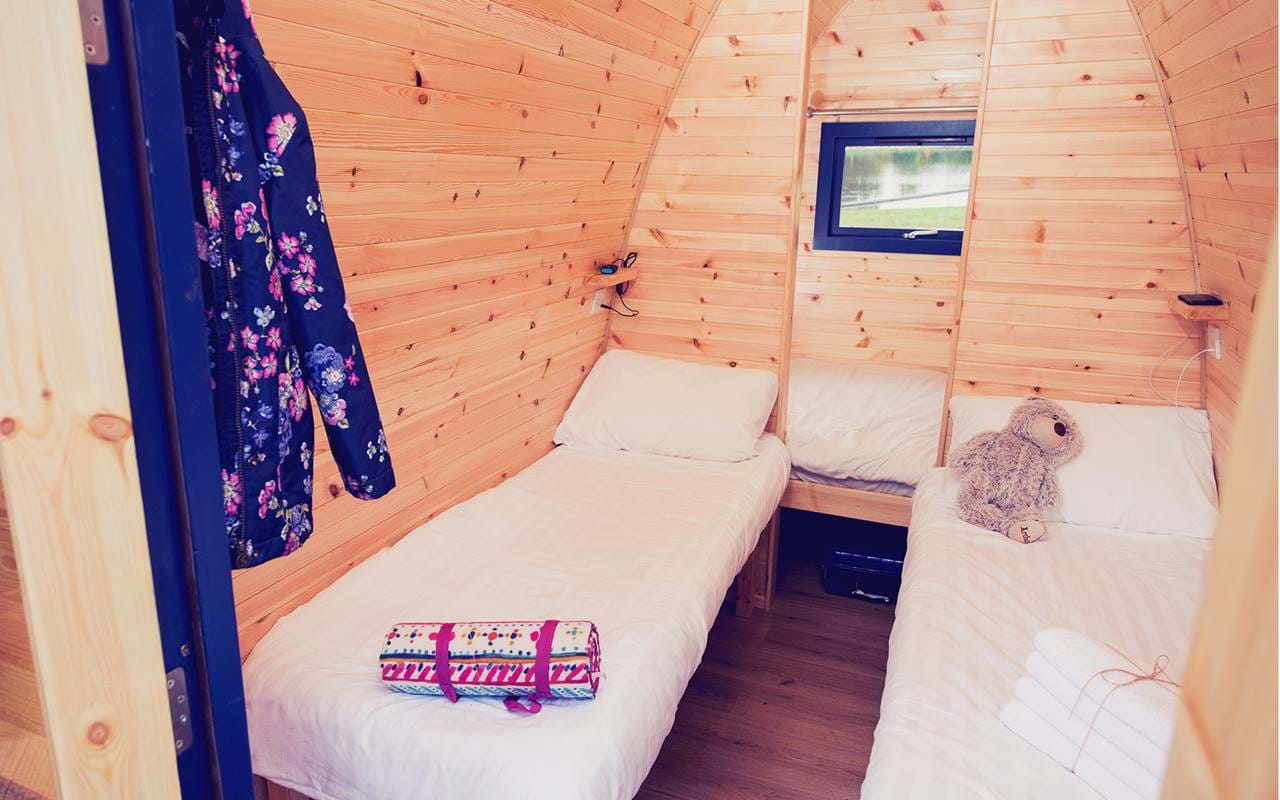 Each pod sleeps a maximum of 4 with 1 double bed and 2 single beds inside. This unique accommodation is in a camping style with the toilet, shower and accessibility facilities all located in a facilities block in the Pod camp.