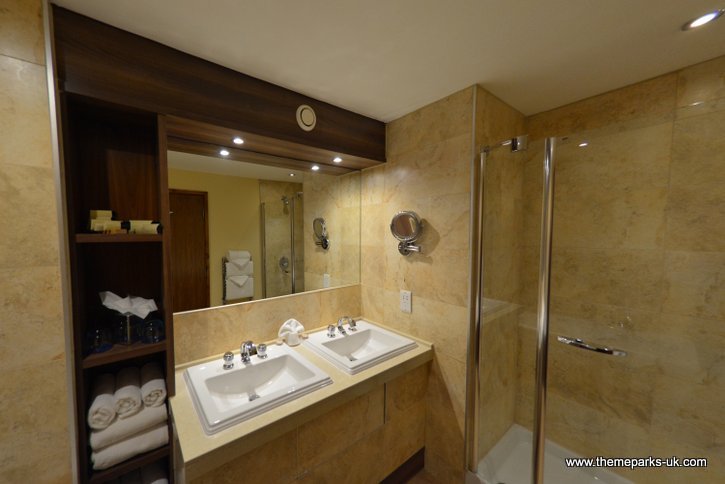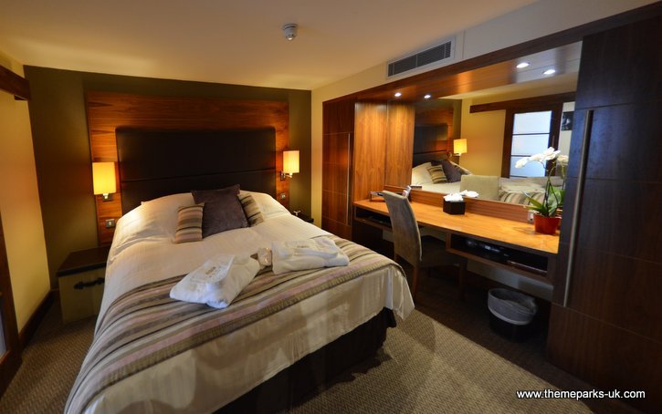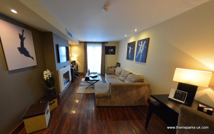 We were very impressed with our Deluxe Suite on the top floor, from the moment we stepped inside the stylish hallway with unusual art and scented sticks, through to the spacious lounge with large corner sofa, and into the beautiful bedroom with a king size bed. The lounge features a modern fireplace, large flat screen TV and a juliet balcony with views of the park. It's incredibly exciting to see roller coasters hurtle past your room!
