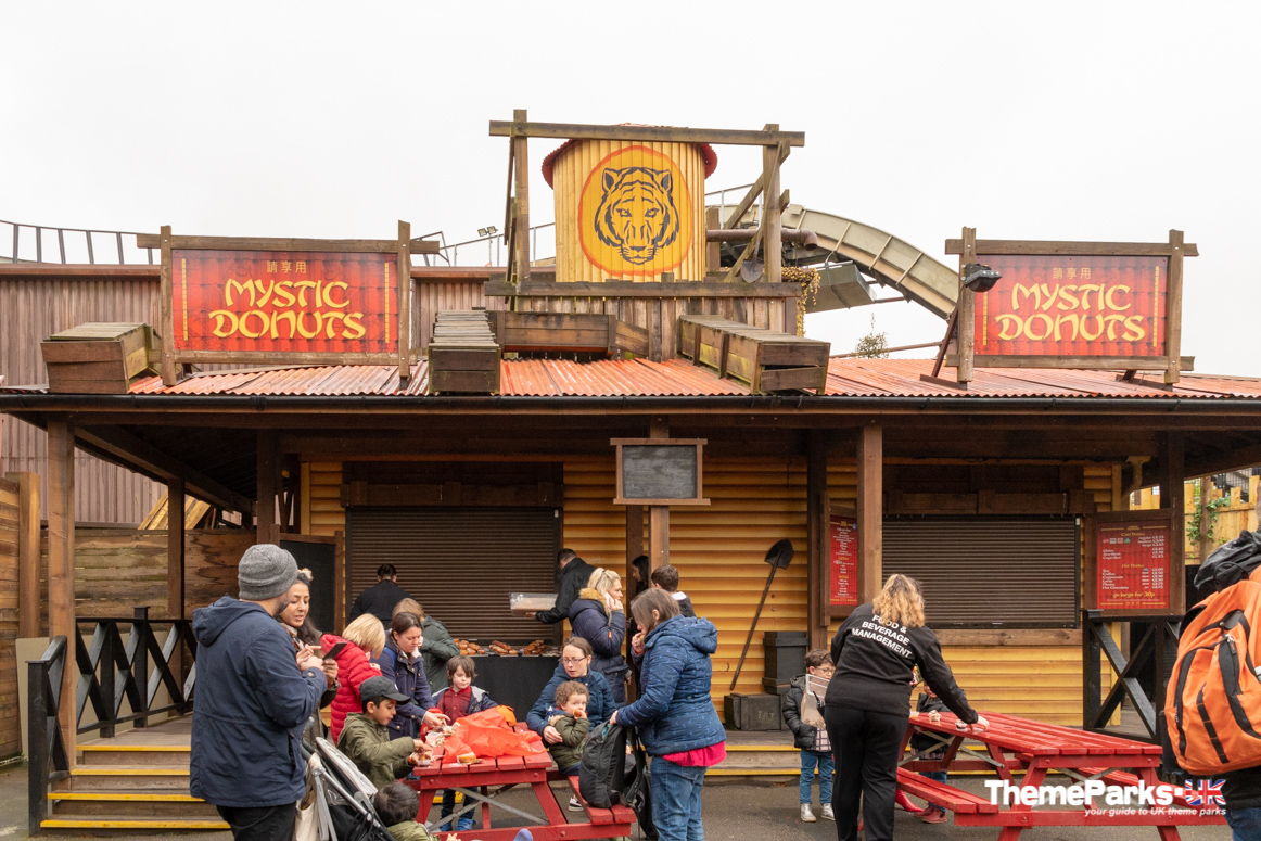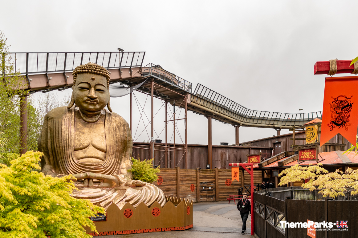 After passing under the second tiger crossing there is a brilliant walkway that allows both visitors and the tigers to cross over the water ride, with just a glass wall between you! This provides a fantastic opportunity to view these beautiful animals up close. Beyond this, the giant Buddha that was part of the former Mystic East remains, as well as Mystic Donuts.