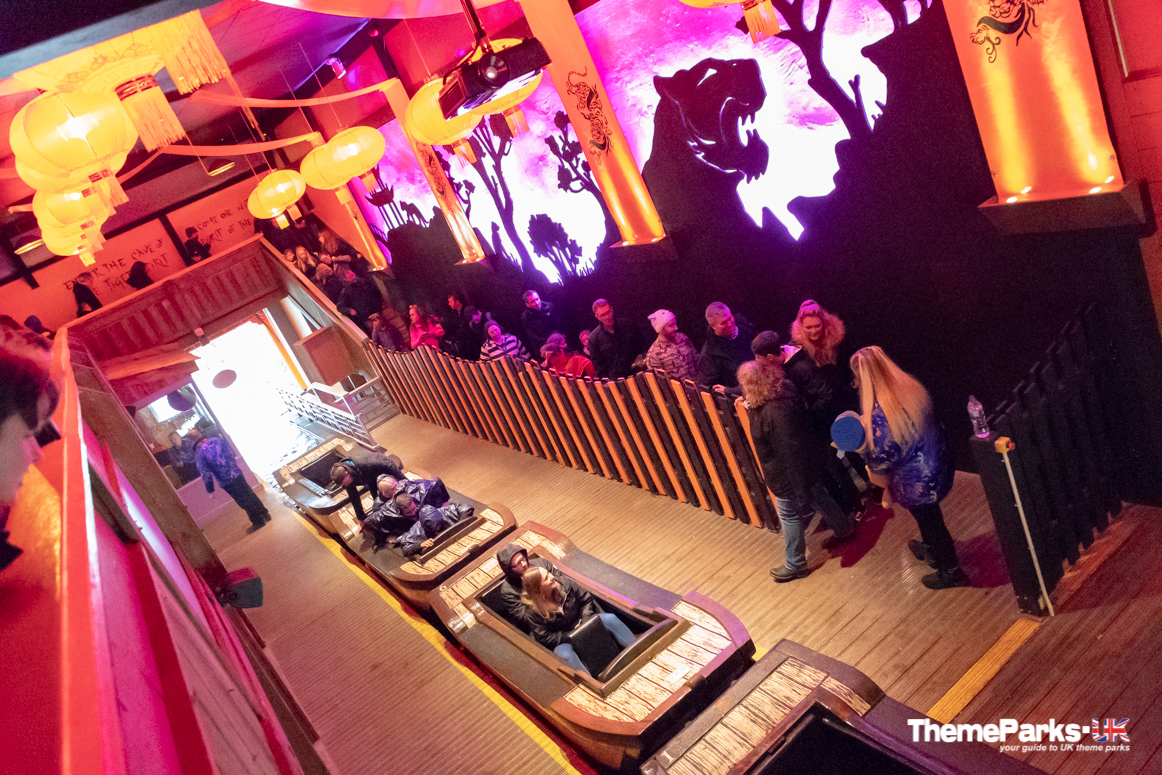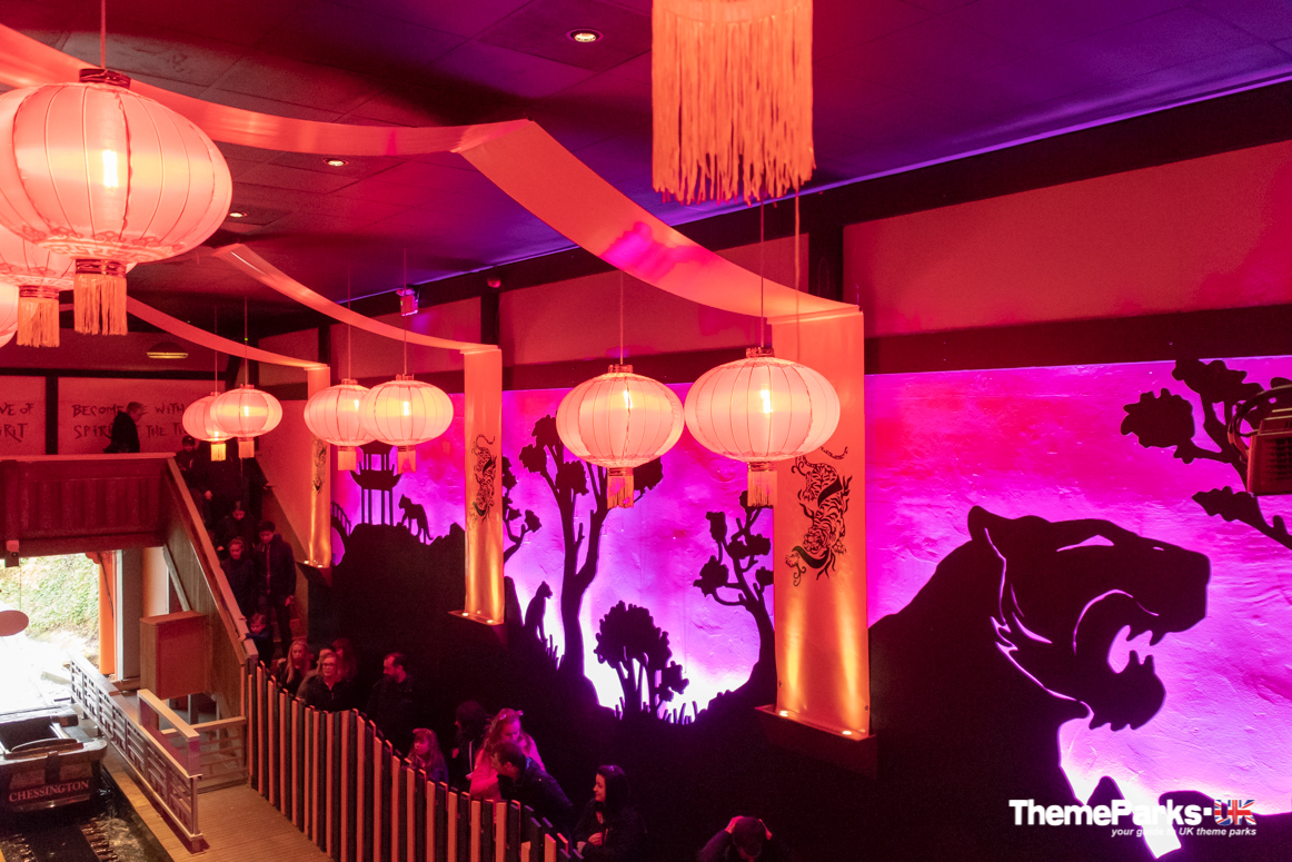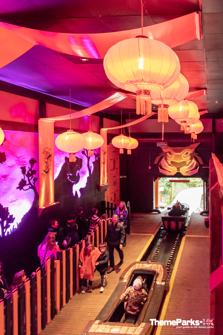 Once you reach the village, there are colourful buildings all around with a festival feel, and an eye catching entrance to the ride. Once inside the station there are red and gold lanterns, tiger murals and a mini sound and light show every few minutes.