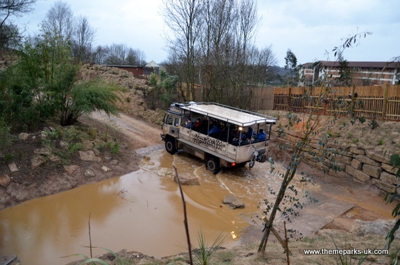 There is an impressive entrance and bridge, a themed waiting area featuring a pre-ride video introduction, before visitors board a safari truck which is driven around the trail by a guide. Along the route vehicles pass though each of the animal enclosures, several splash zones and into a cave section with water finale.