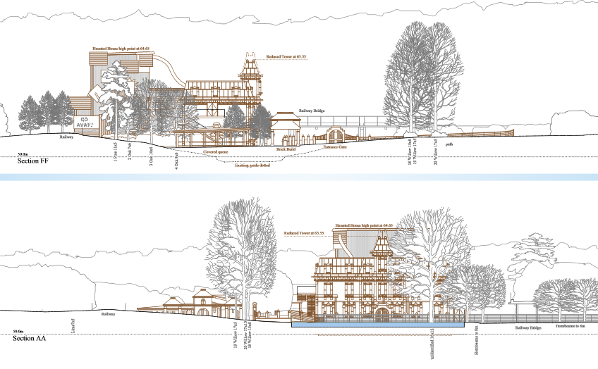 The proposed Haunted House would be located in the area between the Heartlake Express railway track and the footpath from Coastguard HQ to Atlantis - Submarine Voyage. The attraction is a drop ride housed within a themed Haunted House building with a maximum height of 13.15m. The height of the front of the Haunted House façade has been reduced by 1m as part of the revised planning application.