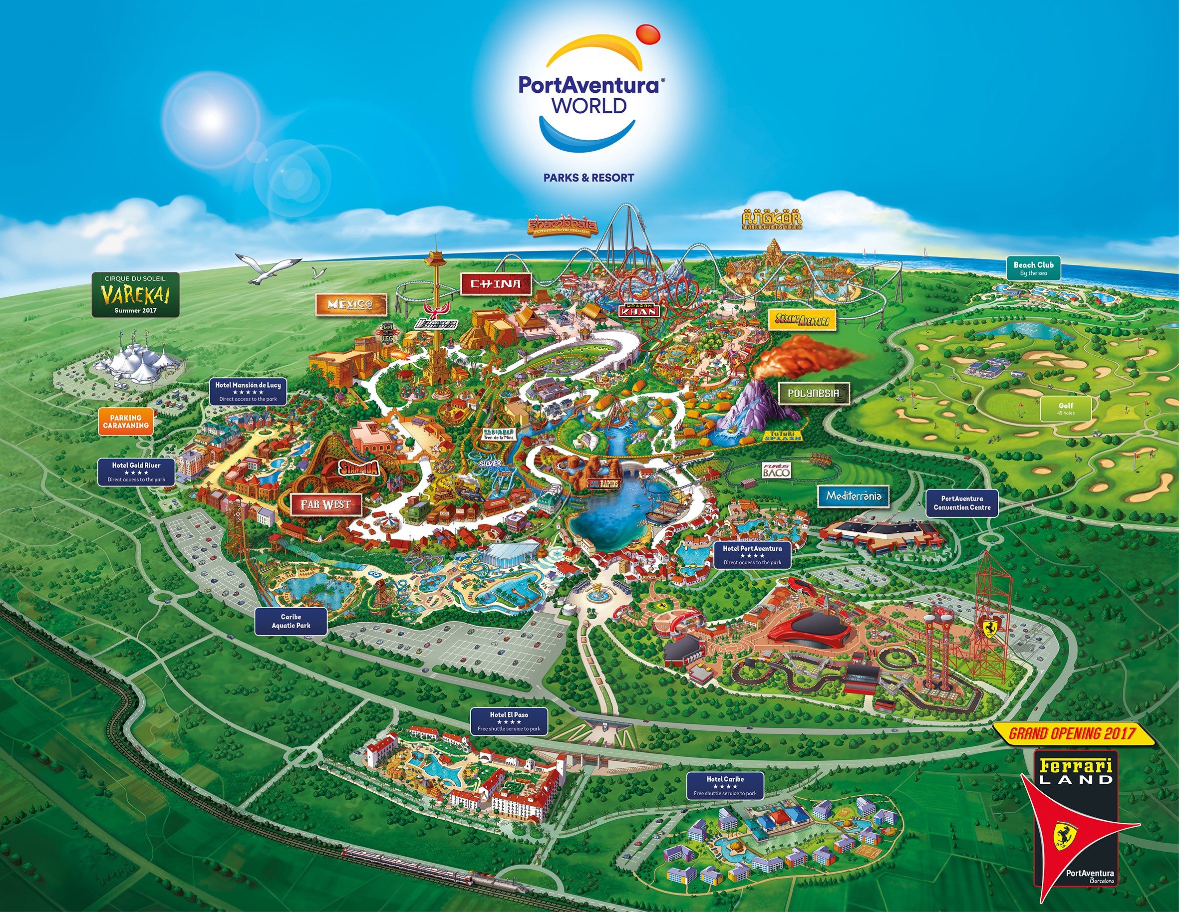 As the park is located by the Mediterranean Sea, visitors are welcomed on the shores of Mediterrània. From this area, you take a journey through the beautiful islands of Polynesia, colourful and lively México, exotic China, and the perilous Far West. There is also a place specially designed for the little ones: SésamoAventura. There are 41 attractions for all ages and more than 40 daily performances. There are also 47 food and beverage outlets and 51 shops.