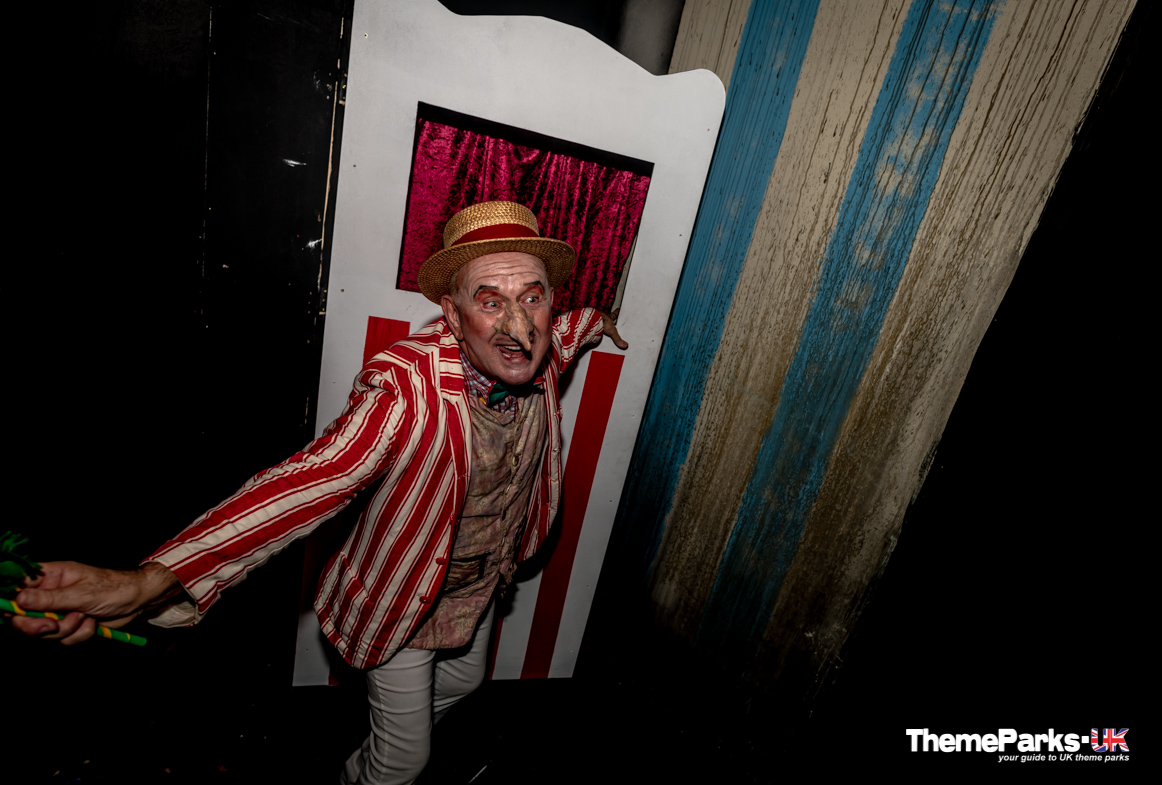 - Punch and Judy Horrorshow - our final attraction of the night, and what a great way to finish. After a 'welcome' from the sinister puppeteer, you are sent inside the show where you encounter giant versions of Mr Punch, Judy, The Baby, The Constable, Joey the Clown, The Crocodile and The Skeleton. The costumes are fantastic and the whole experience is completely bonkers.