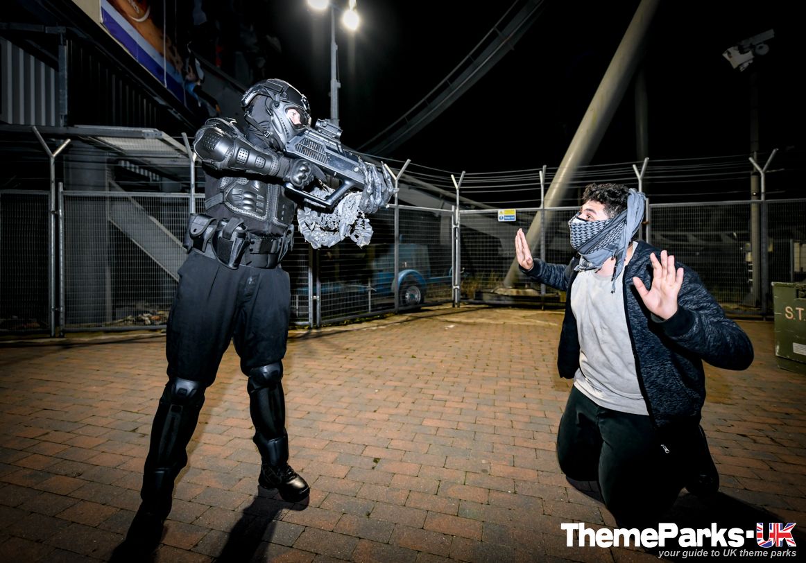This scare zone attempts to convey a narrative across SWARM Island and relies mainly on the existing theming in the area. The route was a bit too open and there were fewer actors, but the armed alien soldiers were definitely menacing and we found some of the rehearsed scenes to be rather visually powerful.