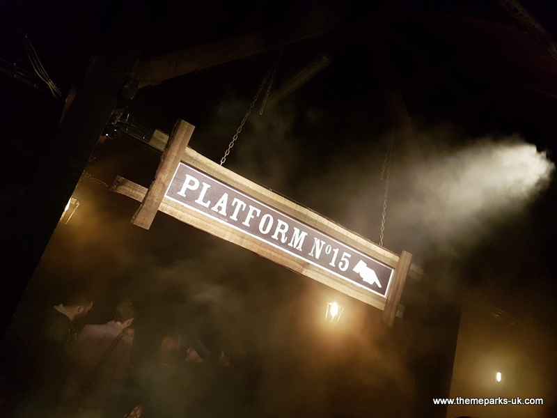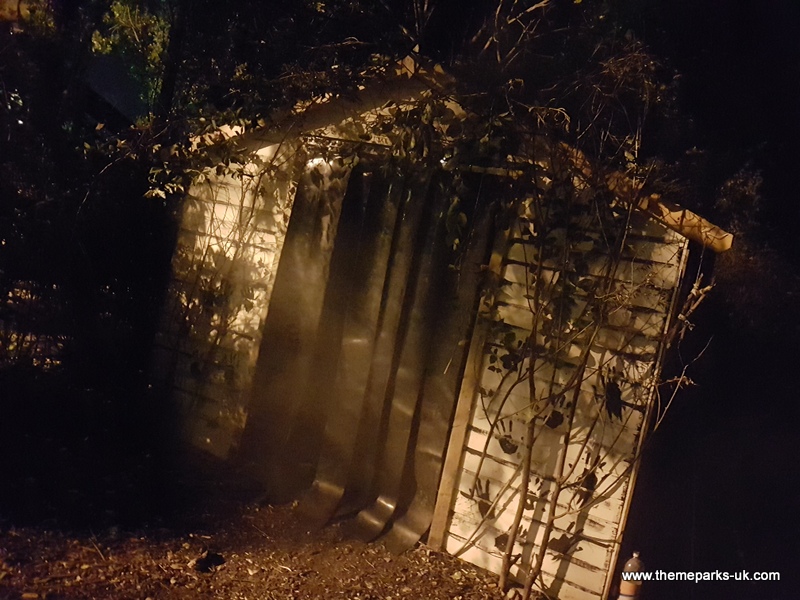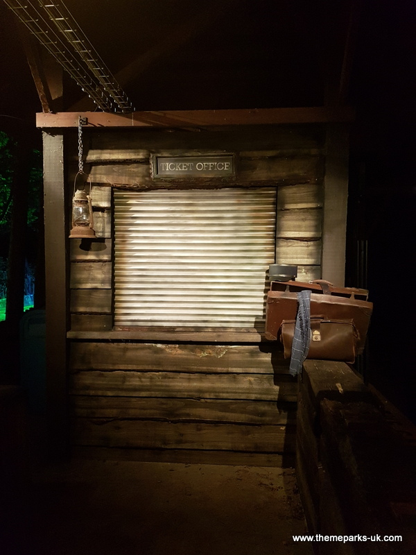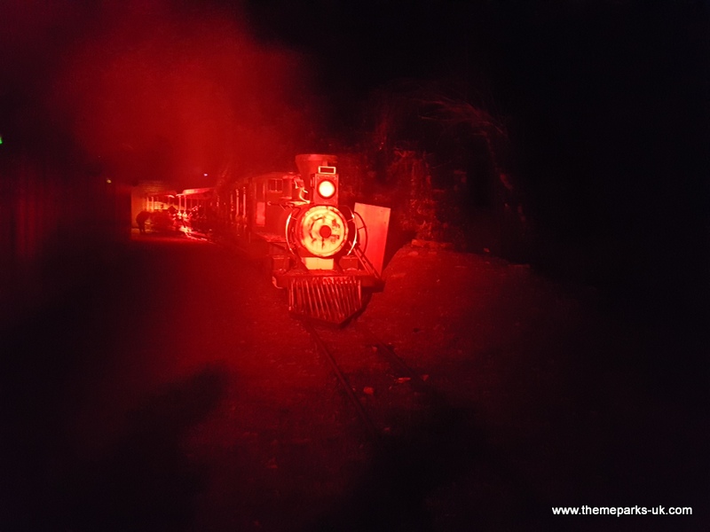 For those of you that remember the Canada Creek Railway, new walkthrough Platform 15 follows the route of the now abandoned loop around the back of Logger's Leap. It's a very long walk, so easily the longest Fright Nights attraction in history, but as a consequence there are long sections where very little happens. You begin your experience on the platform of the former railway station with a photo opportunity by a themed ticket office amidst clouds of smoke. You're then marched off to find out what happened to the train and its passengers and before long you see the train blasting fire in the distance. After a brisk walk you arrive to find it inhabited by a couple of lost souls before walking further on and encountering a few other actors. After passing through a rocky gorge you must navigate a gauntlet of zombies before entering a long tunnel, and after a lot of walking in the dark you reach the end where a seance takes place to communicate with the guard of the train who then appears at the end.