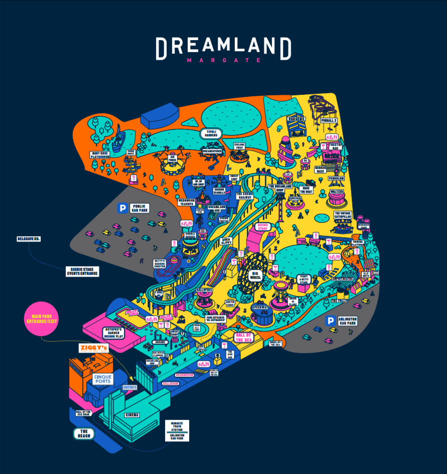 Located opposite the golden sands of Margate, visitors to Dreamland can enjoy vintage, family and thrill rides, pop-up entertainment, live music and art installations, alongside eclectic bars and street food.