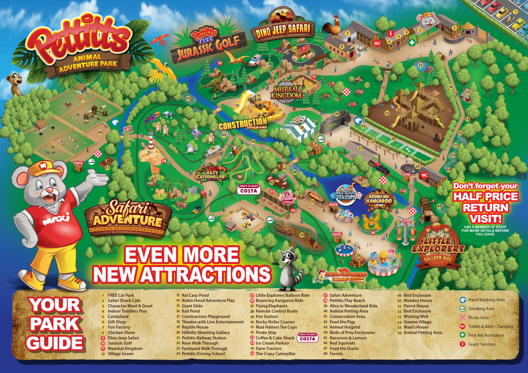 Pettitts Animal Adventure Park in Norfolk is home to rides and attractions including a Rocky Roller Coaster, Safari Adventure, Crazy Caterpillar Roller Coaster, Bouncing Kangaroo Ride and Dinosaur Adventure Golf.